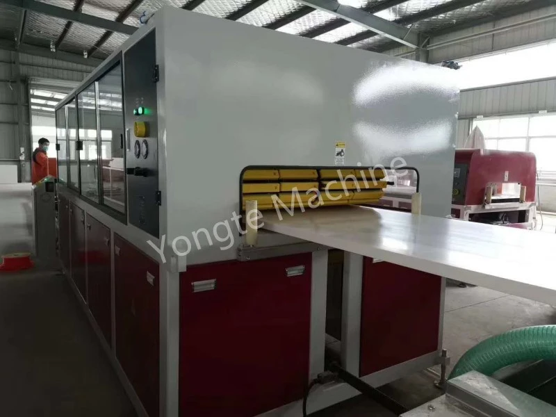 Model i konfiguracja sprzętu: Zainstalowana linia wykorzystuje stożkowy system wytłaczania dwuślimakowego SJSZ80/156, wyposażony w automatyczne podawanie, kalibrację próżniową, stabilną trakcję, precyzyjne cięcie, przycinanie krawędzi i zaawansowany system sterowania. Linia może wykonać max. Panele drzwiowe z PCV o szerokości 900 mm z profilami pustymi z żywicy PVC i CaCo3 jako wypełniacza.